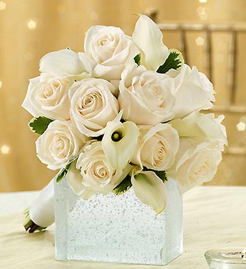 On your wedding day, nothing is more classic or elegant than an all-white bouquet. We’ve filled ours with delicate roses and crisp mini Calla lilies, and finished it off with a matching white satin ribbon. Beautifully hand-arranged by our team of expert florists and available in three sizes, it’s as perfect a pairing as the happy couple.