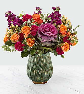Celebrate the season with a fresh take on traditional harvest arrangements. Comprised of purple ornamental kale, orange roses, orange spray roses purple stock and peach hypericum berries, our Autumn Harvest Bouquet is a simply stunning arrangement. With gorgeous blooms completed by a sophisticated, statement vase, this bouquet is perfect for celebrating the season your way with its unique style. Bouquet sizes are approximate.