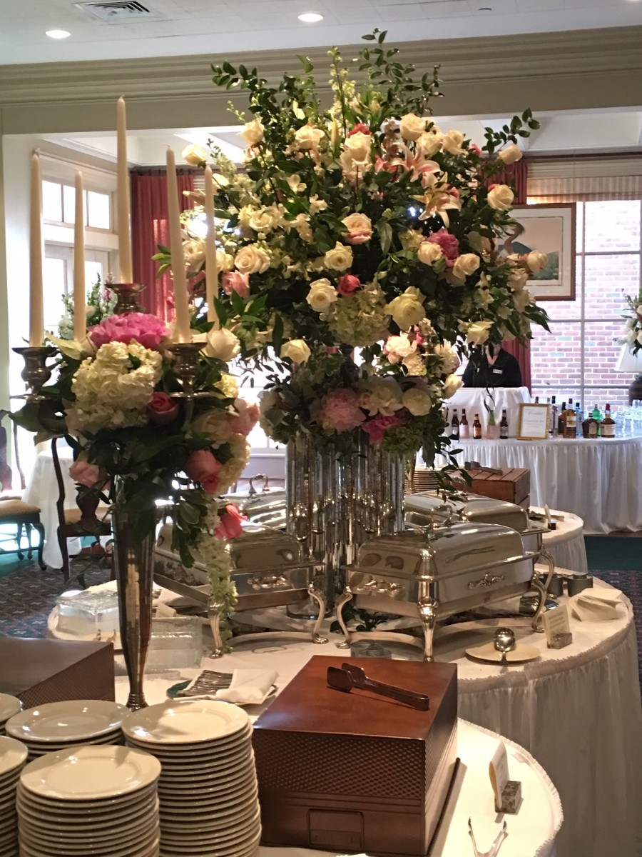 Combination of tall flowers, accented with tall silver candlelabra on each end with flowers and greeery accents on candlelabra
