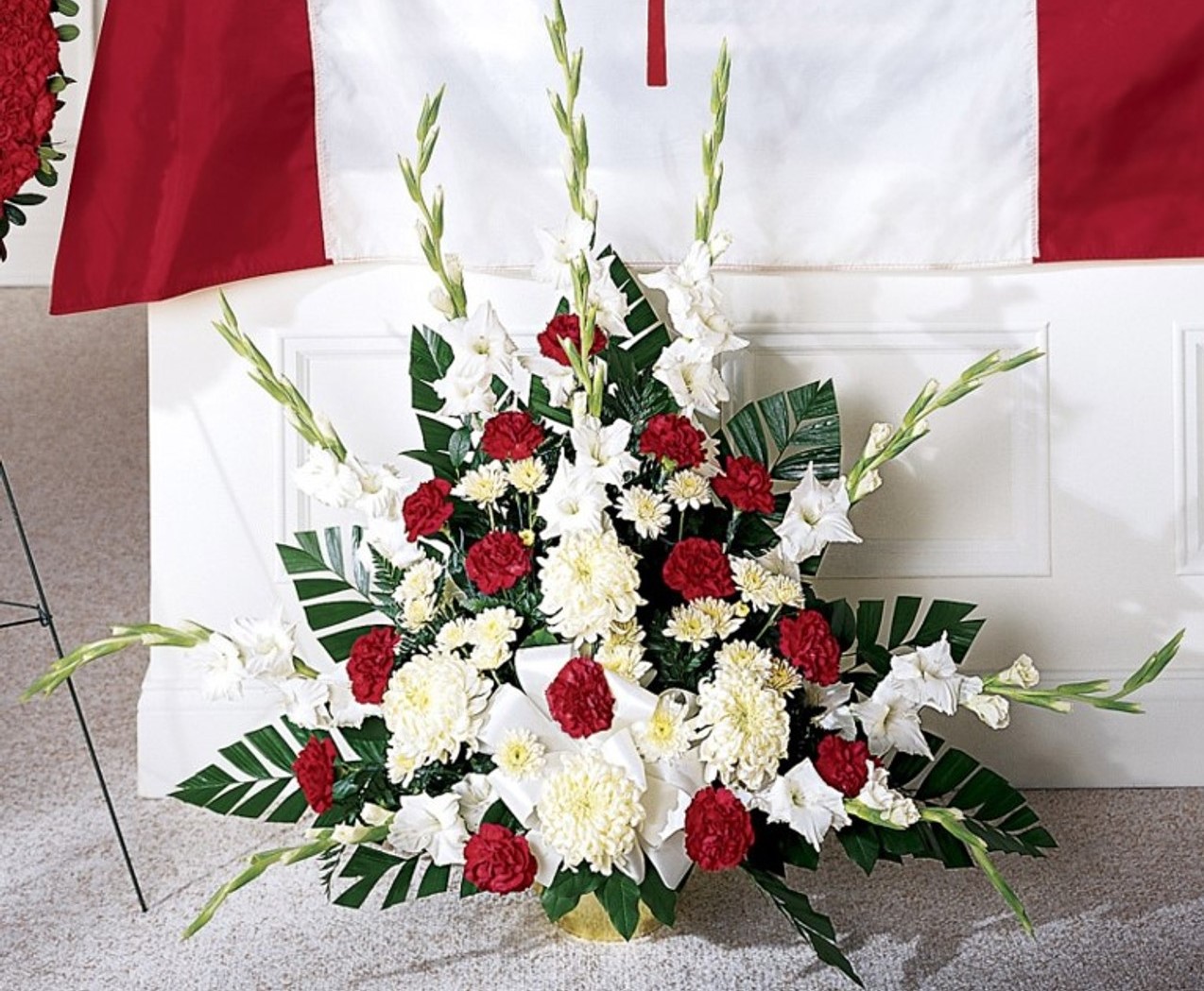 This patriotic arrangement is a beautiful tribute to anyone who’s served our country. A bold combination of red & white is accented with assorted greenery and a complementary bow.
