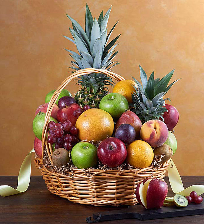 Our abundant basket of fresh fruit, selected and hand-packaged by our florists, will show your good taste on any occasion. Fruits such as kiwis, pineapples, grapefruits, apples or plums are beautifully arranged in a delightfully deluxe gift.