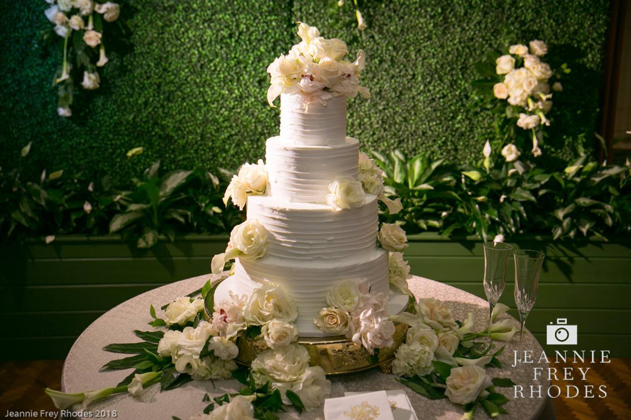 We can do the flowers on your wedding cake or add flowers, plants and even decorate a back drop. Here at the Baton Rouge Country Club we pulled out all the stops to make this a perfect “picture taking setting” for the Bride and Groom. Roses, peonies, orchids, hydrangea and natural foliages make a complete wedding cake display