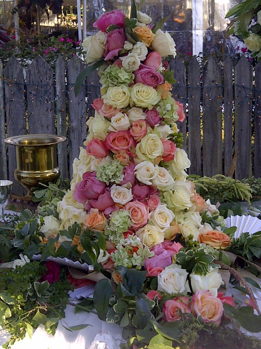 Cake full of solid flowers. Beautiful roses, hydrangea can be done in mixed colors or solid white and creams in this beautiful outdoor wedding.