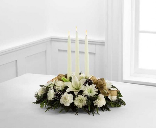 The Glowing Elegance™ Centerpiece celebrates the holiday season with winter grace and style. White Asiatic lilies, carnations and chrysanthemums create an exquisite display accented with holiday greens, snow-tipped pinecones and sheer copper ribbon. Surrounding three white taper candles, this holiday centerpiece will add light and love to their seasonal celebration.B