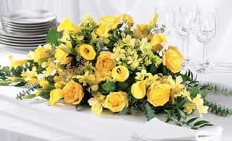 This centerpiece holds sunny, golden garden flowers. Yellow roses, yellow mini calla lilies, yellow dendrobium orchids and green hydrangea with baby blue and seeded eucalyptus will cast a happy glow for your reception or party.