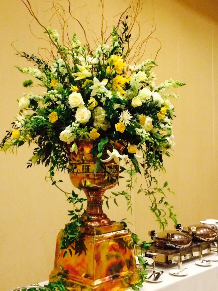Beautiful centerpieces in your choice of flowers and colors. Here in a beautiful copper urn on a copper stand, also avaialbe. silver, crystal, brass, wood, iron stand and many other possibilities. This beautiful centerpice at the Hilton Capital of BR ballroom is just an example of the special flowers we can custom design for your wedding