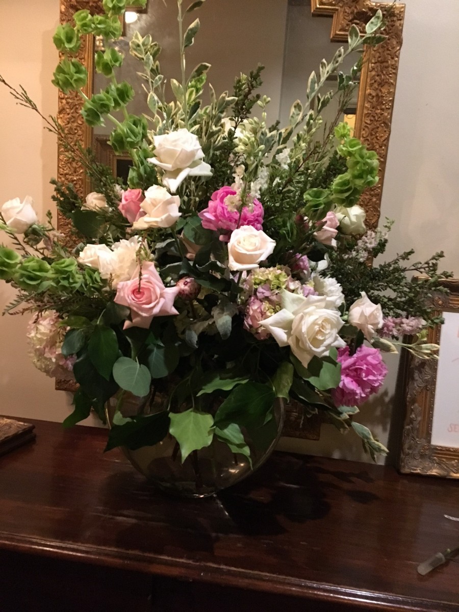 Beautfiul entrance flowers on table in large oval half moom vase at the City Club