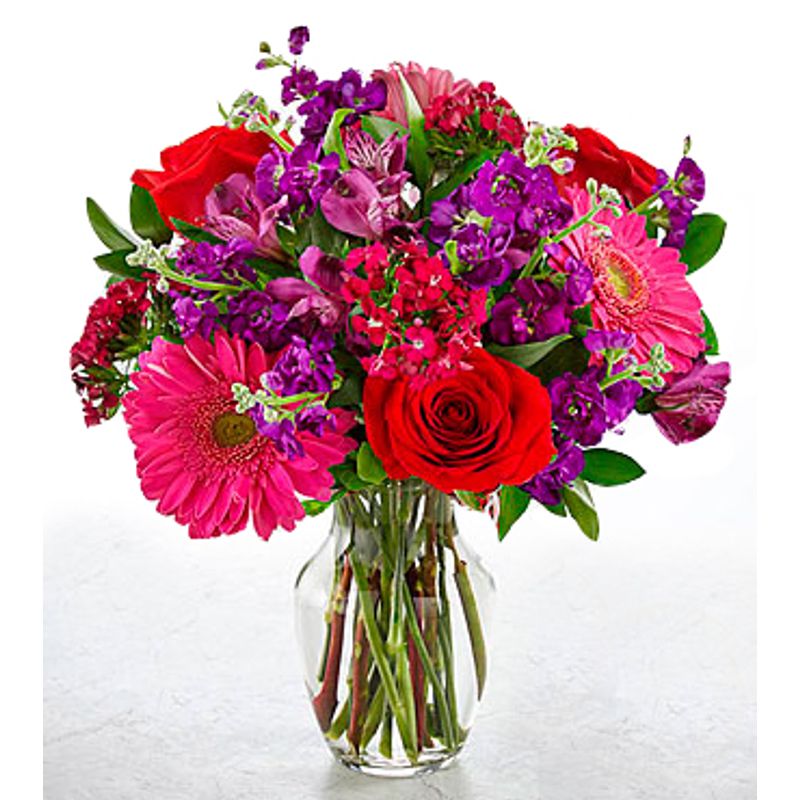Picked fresh from the farm, our Lucky in Love Bouquet creates the perfect Valentine’s Day gift! Hand gathered at select floral farms, this bouquet brings together bright pinks, eye-catching purples, and bold reds to create a Valentine display that would make Cupid proud. Picked fresh for you, this flower bouquet is a wonderful gift to send to your favorite friends, family, or special someone in honor of this coming February 14th. Bouquet includes: red roses, hot pink gerbera daisies, purple gilly flower, purple Peruvian Lilies, hot pink dianthus, and lush greens with a keepsake embossed red glass vase.