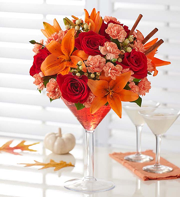 Serve up smiles with our fresh take on a popular cocktail! Rich roses, lilies, mini carnations and more are hand-arranged by our expert florists in an oversized keepsake martini glass. We’ve added sweet cinnamon sticks and crystal accents to really spice things up for birthdays, get-togethers or just because. Arrangement of roses, lilies, hypericum, mini carnations and salal, topped with cinnamon sticks Lilies may arrive in bud form and will open to full beauty over the next 2-3 days Arrives in a keepsake, food-safe, oversized acrylic martini glass filled with yellow and ruby crystal gel; glass measures 9″H Large arrangement measures approximately 17″H x 13″L Medium arrangement measures approximately 15.5″H x 11″L Small arrangement measures approximately 14.5″H x 10″L Our florists hand-design each arrangement, so colors, varieties and container may vary due to local availability