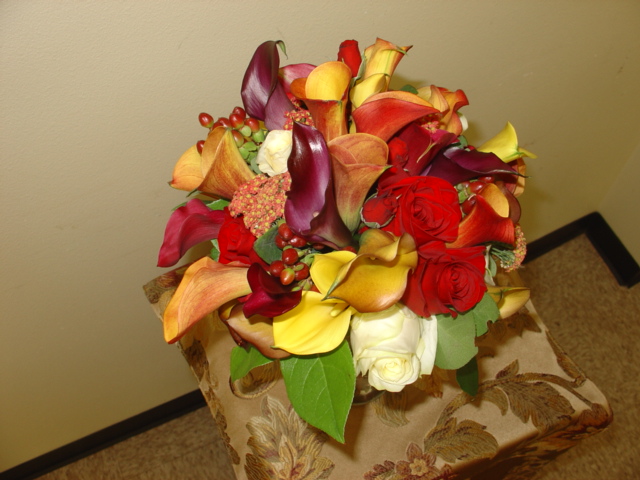 Beautiful fall tone mini calla with red roses and touch of cream