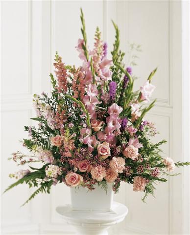 The Peaceful Memories Arrangement features beautiful flowers in many shades of pink to offer your sympathies. This rectangular white handled basket holds all pink gladiolus, roses, snapdragons, and carnations with accents of pink waxflower, monte casino and assorted greenery.