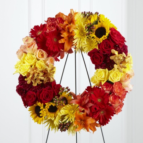 The Rural Beauty™ Wreath is a brilliant arrangement that expresses your grief in the jewel tones of dawns first light. Peace, yellow, red, and orange bi-color roses, burgundy carnations, yellow spider chrysanthemums, red gerbera daisies, sunflowers, orange Asiatic lilies, gold mokara orchids and brown hypericum berries are brought together to form a wreath that honors a life well-lived. Displayed on a wire easel.Approximately 24-inches in diameter.