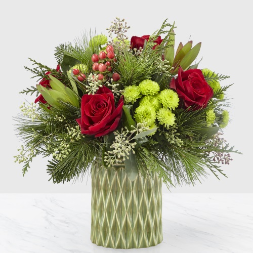 Our Stunning Style Bouquet commands the attention of any room its placed in. Comprised of red roses, protea, seeded eucalyptus and assorted Christmas greens, this collection is handcrafted to turn heads. Give this lovely bouquet in a textured dusty green ceramic vase to those who shine brightest in your life. GOOD bouquet is approx. 13″H x 13″W. BETTER bouquet is approx. 14″H x 15″W. BEST bouquet is approx. 15″H x 15″W. EXQUISITE bouquet is approx. 15″H x 17″W.