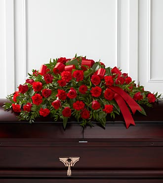 The Dearly Departed™ Casket Spray bursts with the love and passion that the deceased had for their life and loved ones. Rich red roses and carnations are gorgeously arranged amongst lush greens and accented with a red satin ribbon to create the ideal adornment for their casket at their final farewell service.Approximately 40L x 26W.