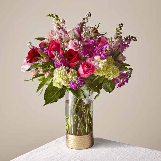It’s the season of love, and this bouquet is the bold, romantic gesture you’re looking for. Three colors of roses (red, pink & hot pink) mixed with hydrangea, snapdragons & more flowers in a glass vase is the perfect way to remind your love that you were meant to be together.
